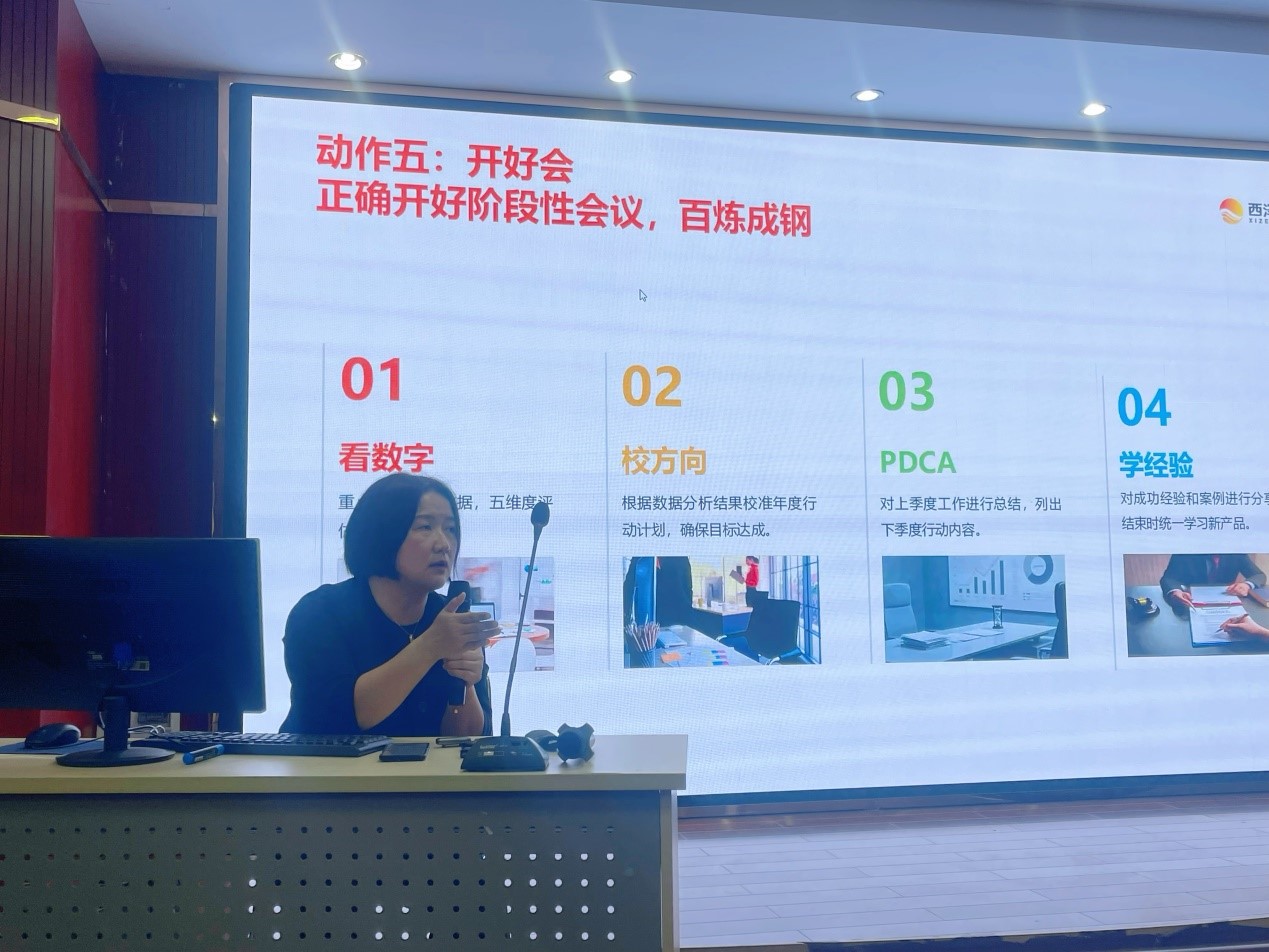 讲座中,赵辉老师提出了六套关键“规定动作”。一是“看市场”,通过“五看”模型洞察行业趋势与机会点;二是“定数字”,运用五维拆解法将目标落实到人;三是“抓重点”,构建规范的CRM与Pipeline管理系统,聚焦重大项目;四是“拓新机”,通过陌拜、展会、安索夫矩阵等工具持续挖掘商机;五是“开好会”,提升营销会议效率,推动PDCA循环;六是“勤学习”,通过“世界咖啡”“销售大比武”等方式萃取与复制成功经验。她强调,销售团队要实现从“野战军”到“正规军”的蜕变,不仅需要战术打法,更要建立系统化的管理机制与持续学习的企业文化。